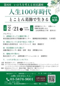 わたクリニック院長渡邉淳子医師が「第8回いのちを考える市民講座」に登壇します。 2026年2月21日(土)13:00~16:00 葛飾区金町地区センター5階ホールで開催される「第8回いのちを考える市民講座」に渡邉淳子医師が登壇します。 投稿日:2026年1月22日 << 渡邉拓史先生が第13回 AYA世代支援勉強会「ぴよぴよの会」にて講師を務めます ||